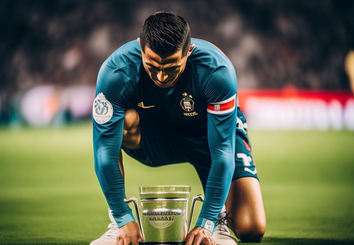 那一刻,球场上的喧嚣仿佛都静止了。C罗,这个历经20年风霜的足球传奇,站在了冠军的领奖台上。他脱下球衣,扔向空中,然后,一个动作让所有人都为之动容——他跪倒在地。